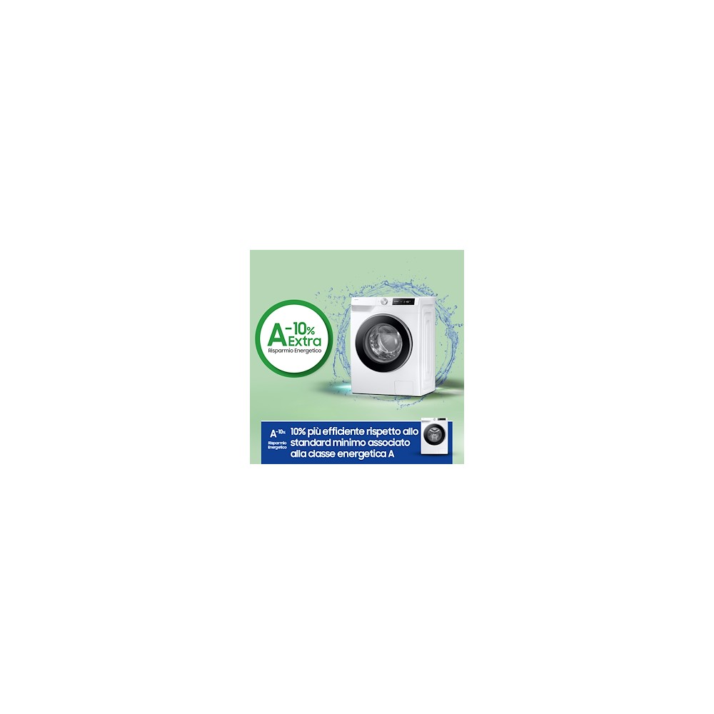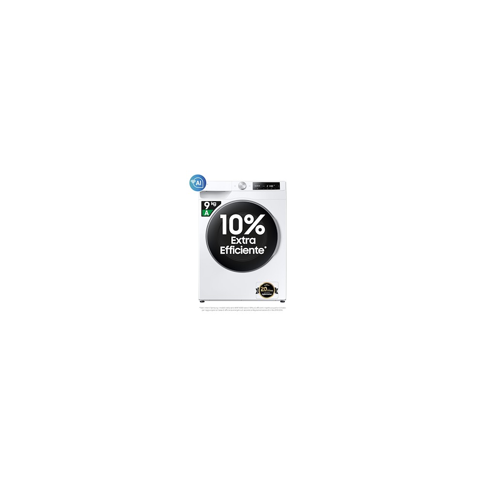 Lavatrice - Carica frontale - Libera installazione (FS) - Capacità 9 Kg - Centrifuga 1400 giri - Classe energetica A - 24 programmi - Con tasto partenza ritardata - Programmi speciali: Eco 40-60°C, Vapore Igienizzante, Rapido 15’, Capi Sportivi, Baby care, Biancheria da letto, Giornata nuvolosa, Cotone, Colorati, Delicati, Jeans, Scarico/Centrifuga, Intenso a freddo, Outdoor, Risciacquo+Centrifuga, Camicie, Silenzioso, Sintetici, Asciugamani, Lana, Eco Wash, Eco Pulizia Cestello Plus, Smacchia Tutto Plus, Super Speed (5 Kg in 39 min) - Smart Control Wifi, Volt Control, Fuzzy Logic, Ai Control, Ai Weather, Ai Notification, Smartlink, LESS Microfiber, Ai Energi Mode, Ai Ecobubble - Cassetto autopulente stay clean - Con Wi-fi - Con controllo remoto APP - Samsung presenta AI Control, con AI Energy Mode che ti permette di tenere sotto controllo e ridurre il consumo elettrico della tua lavatrice verificando facilmente i consumi ed effettuando una stima della tua bolletta. Con AI Ecobubble il lavaggio è più efficace. Crea bolle in grado di rimuovere il 24% di sporco in più già alle basse temperature, con un risparmio di energia del 70% e tessuti più protetti del 45,5%. Questo modello è dotato anche del SuperSpeed che consente di risparmiare tempo senza compromettere le performance del tuo carico giornaliero. Samsung ha sviluppato il ciclo Less Microfiber che riduce fino al 54% la dispersione delle microplastiche prodotte durante il lavaggio. La lavatrice è dotata inoltre di opzione Vapore Igienizzante e di Motore Inverter garantito 20 anni.
